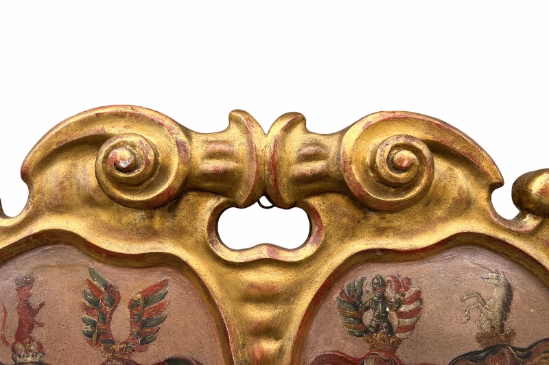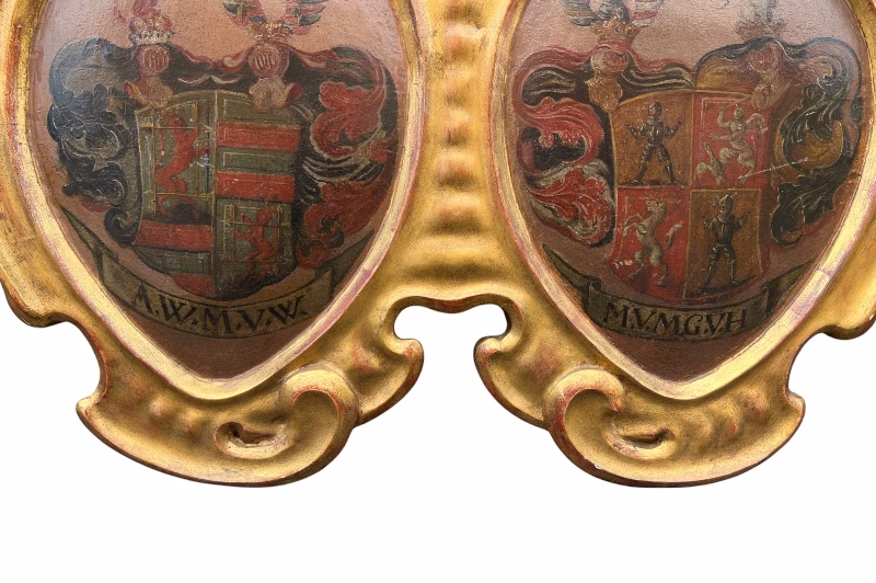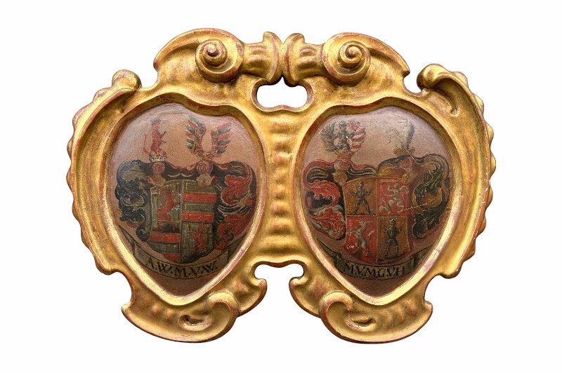 Hier sehen Sie ein altes Wappenschild bei dem es sich um ein Kompositwappen, Familienwappen oder auch Allianzwappen handeln könnte.