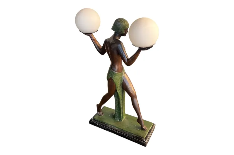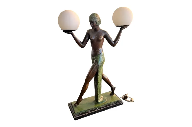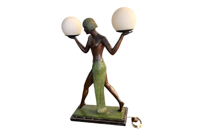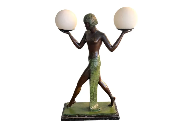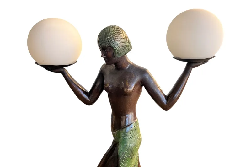 Art Deco Bronzelampe Dame mit zwei Sphären