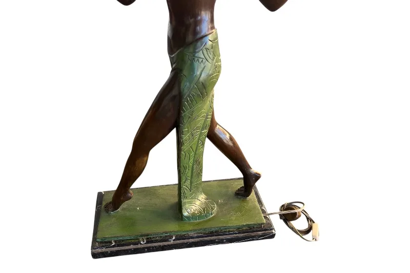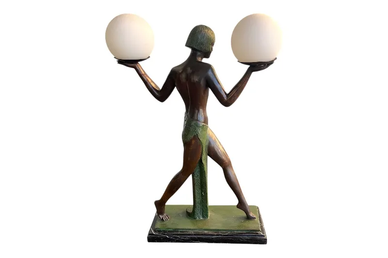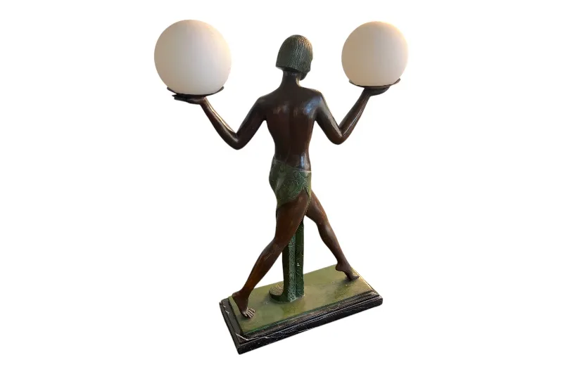 Hier sehen Sie die Bronzelampe in Form einer Art Deco Tänzerin, die zwei Sphären auf ihren ausgestreckten Handflächen balanciert.