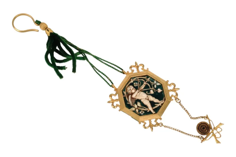 Die Ballspende wird von einem Emblem geschmückt, dass einen Amor auf einer Blumenranke darstellt, der sich in Weiss von dem dunkelgrünen Samthintergrund abhebt.