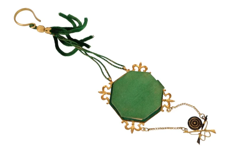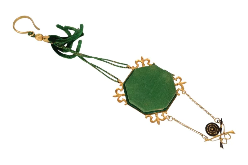 An den unteren zwei Ecken sind zwei Kettchen Angebracht, die mit einem Anhänger verbunden sind, der zwei gekreuzte Gewehre unter einer Zielscheibe zeigt.