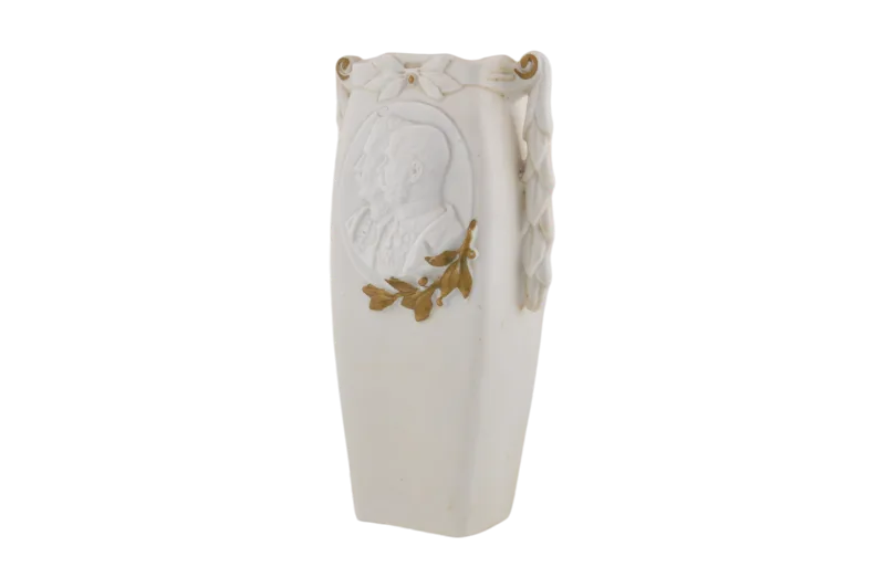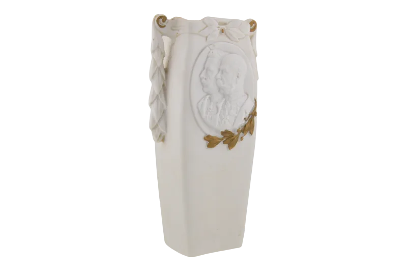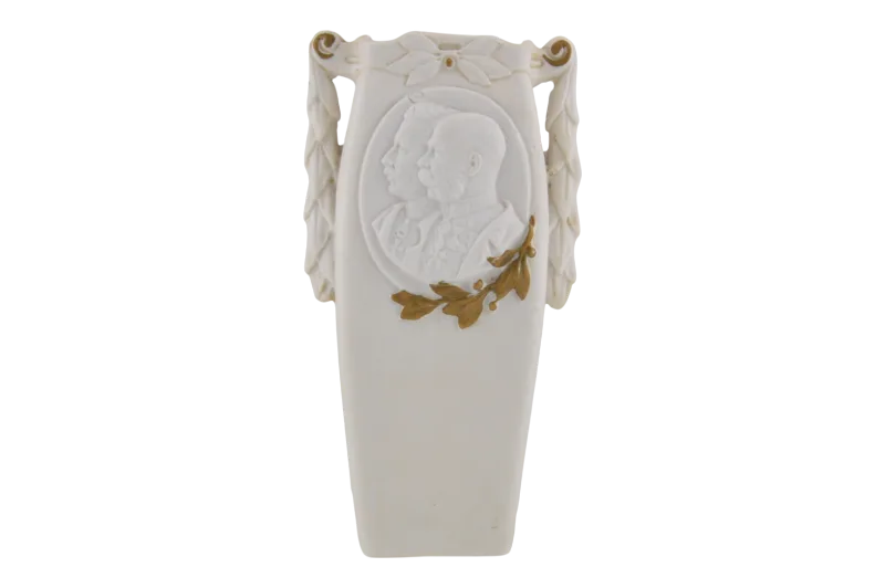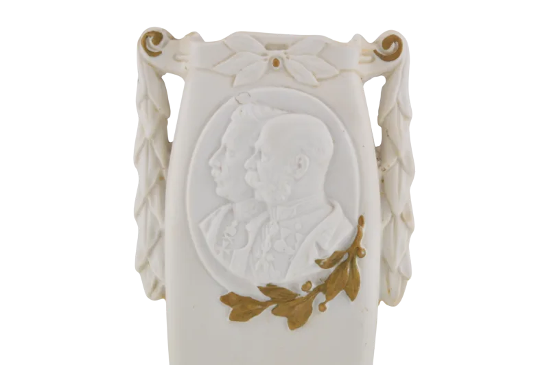 Hier sehen Sie die Vase aus Biskuitporzellan, die prunkvoll Kaiser Franz Josef und Kaiser Wilhelm der K. u. K. Monarchie abbildet.