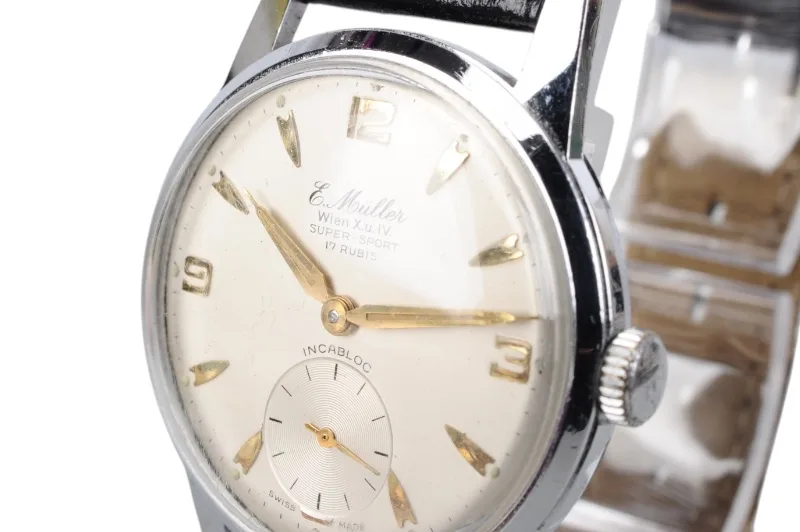 Hier sehen Sie die Armbanduhr von E. Müller, Wien X u. IV in der Ausführung Super-Sport.