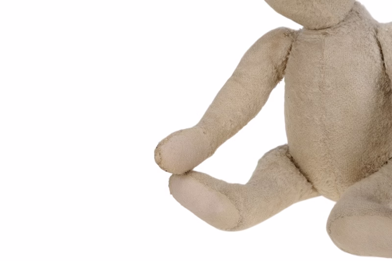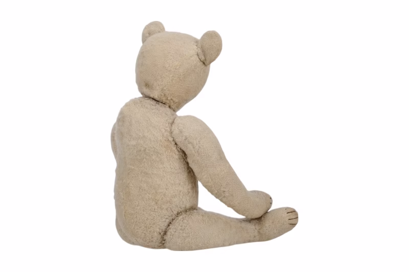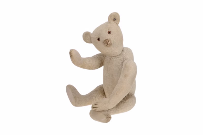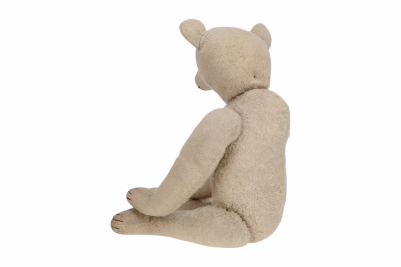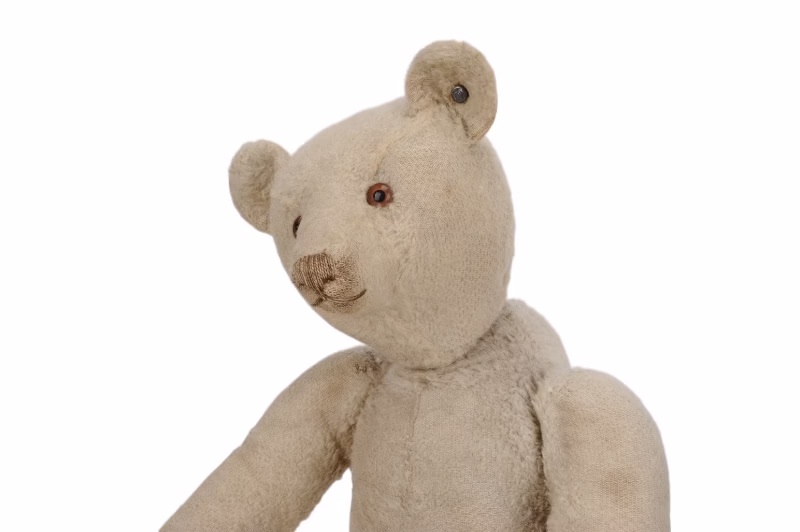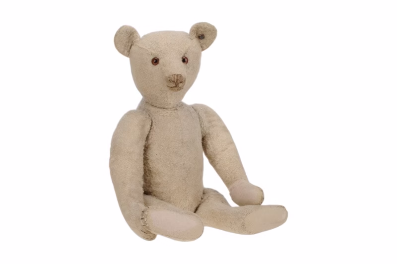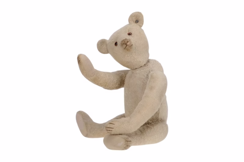 Der Teddy trägt einen Steiff Knopf mit langgezogenem F im Ohr.