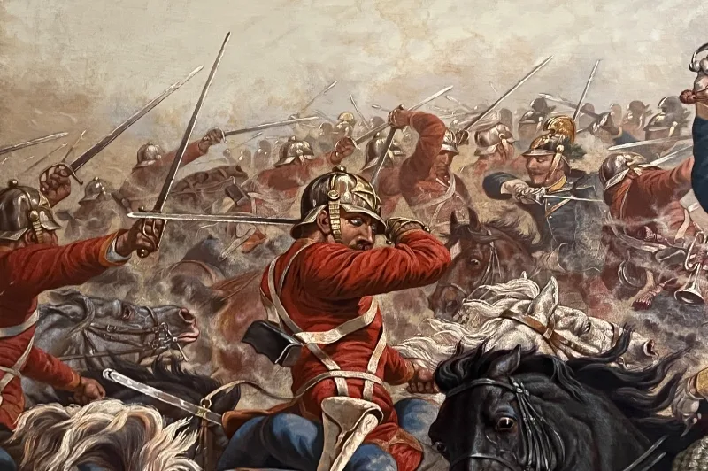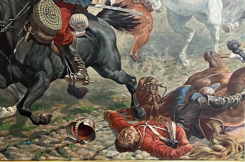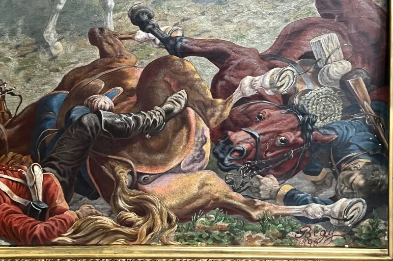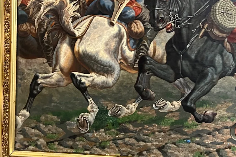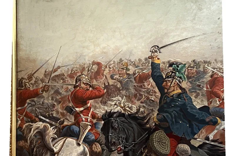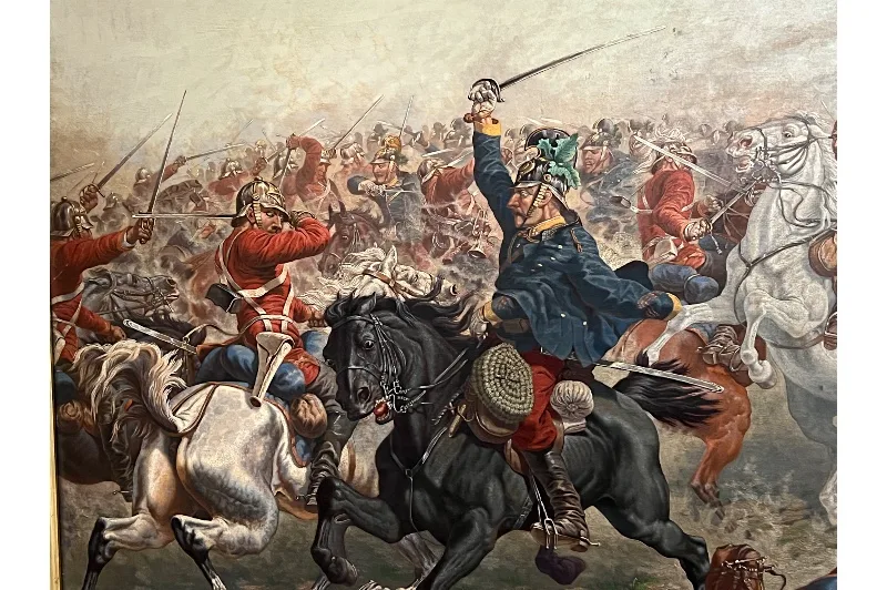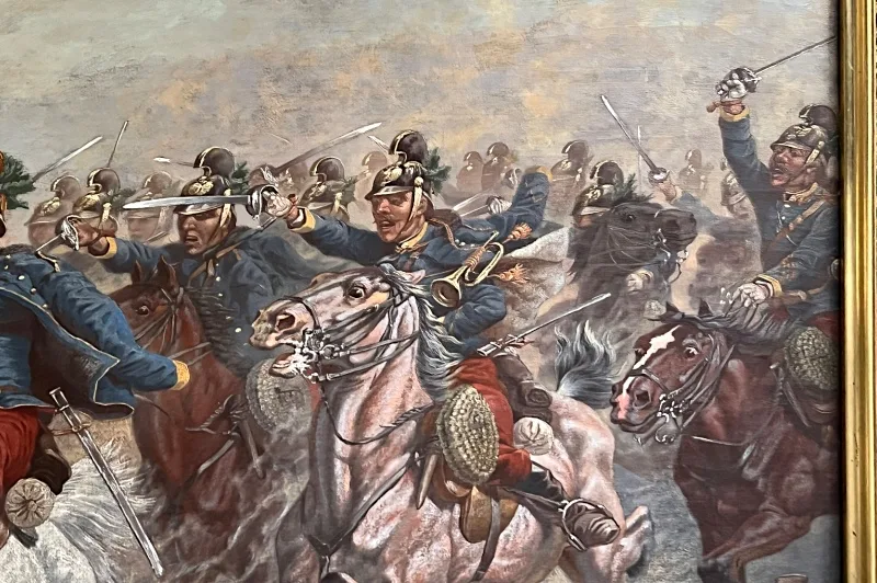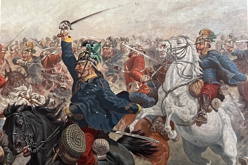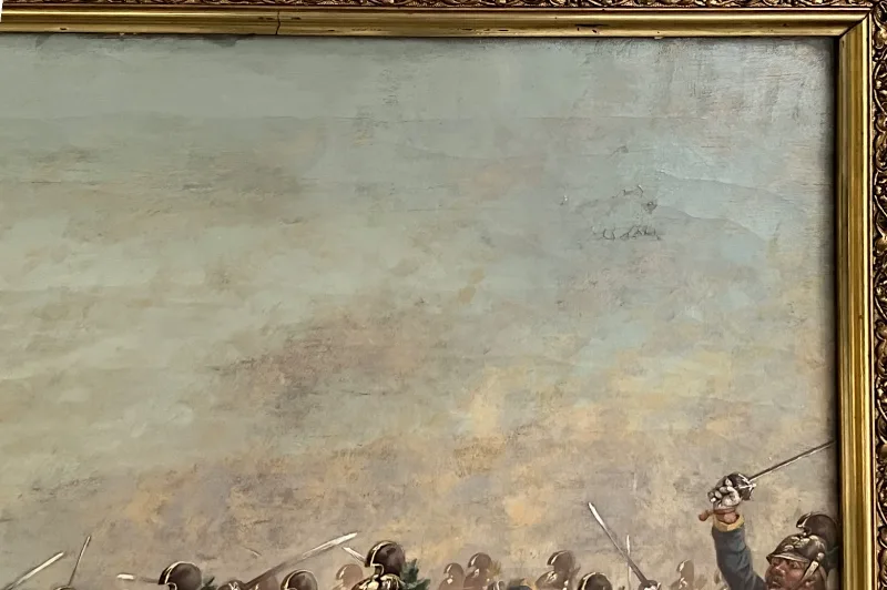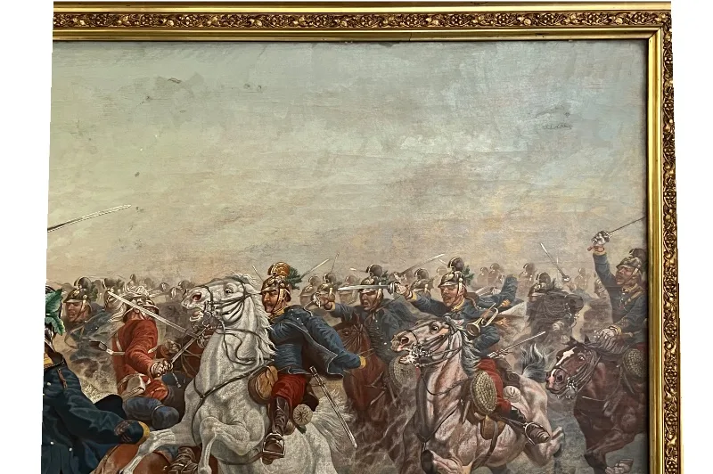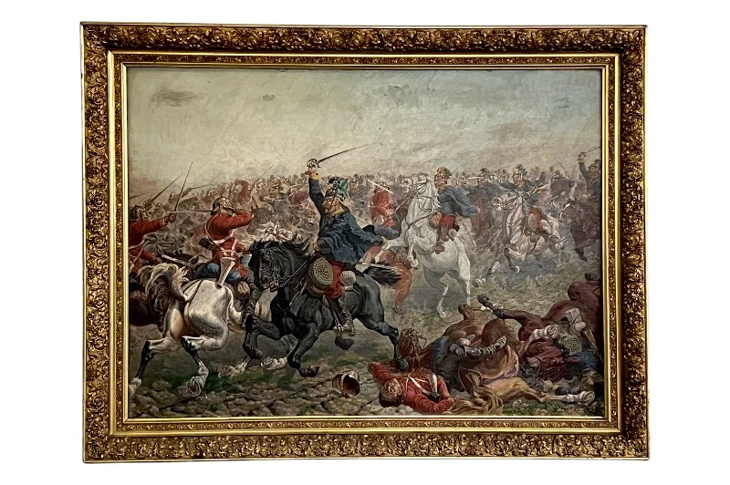 Hier sehen Sie ein eindrucksvolles Ölgemälde, welches eine militärische berittene Kampfszene abbildet.