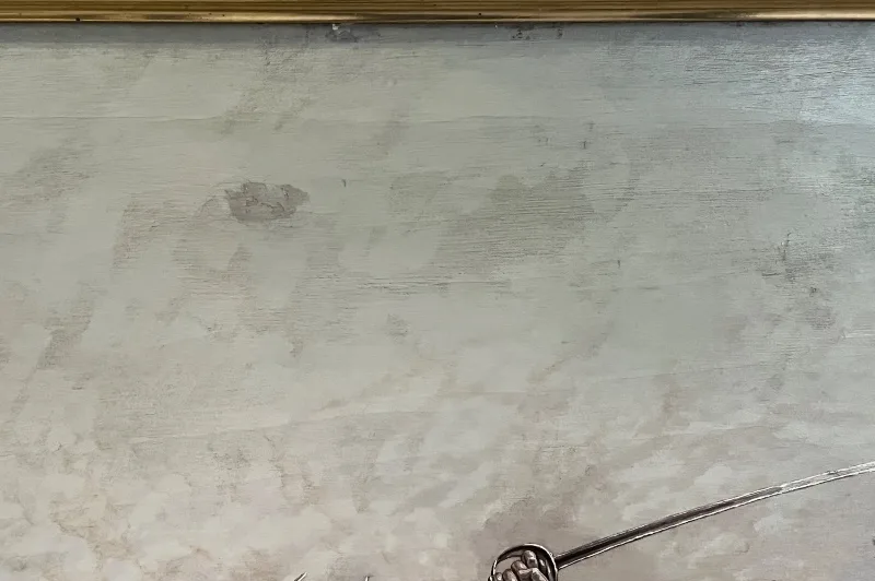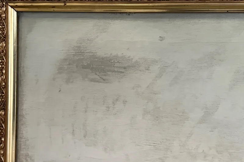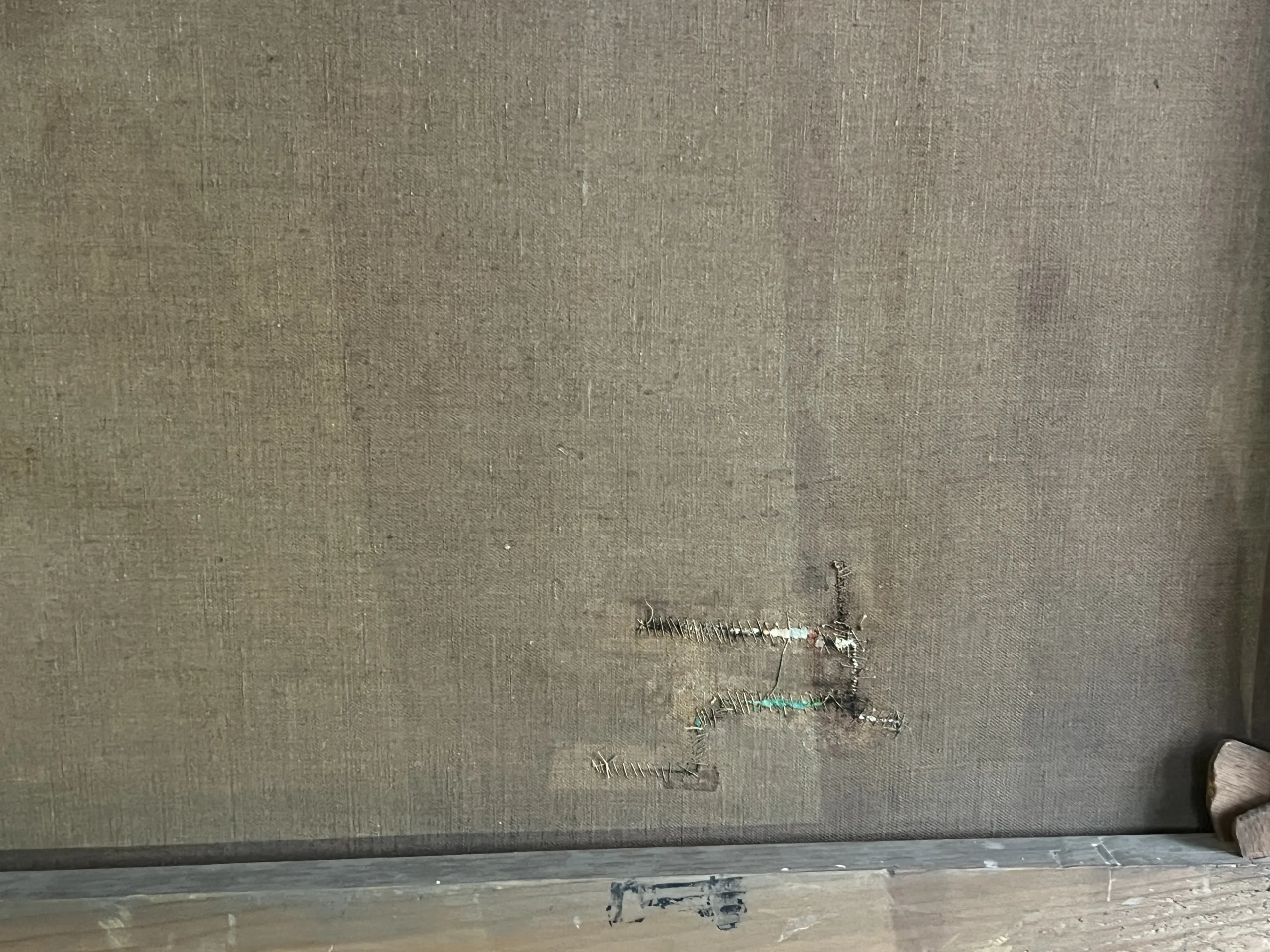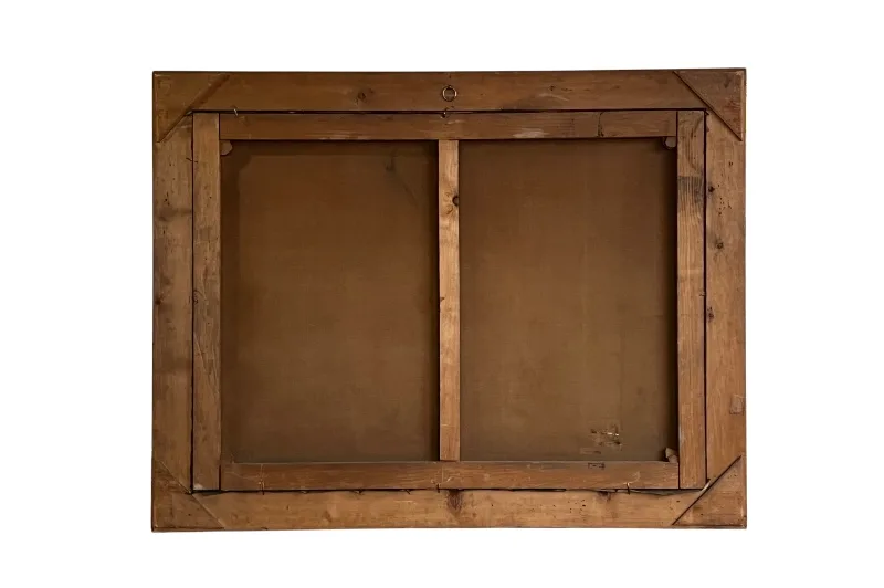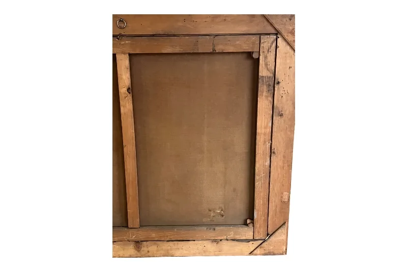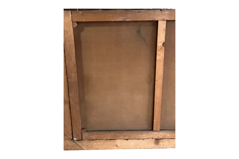 Die Farboberfläche des Bildes ist stabil, birgt partielle Retuschen und auf der Rückseite befindet sich eine kleine Flickstelle.