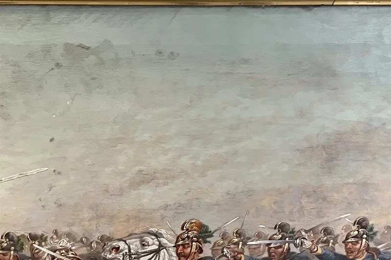 Die Protagonisten des Bildes sind umrahmt von kämpfendem Getümmel, Gefallenen und vorpreschenden Soldaten.