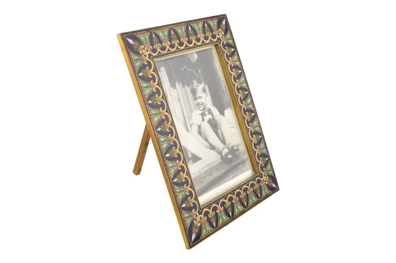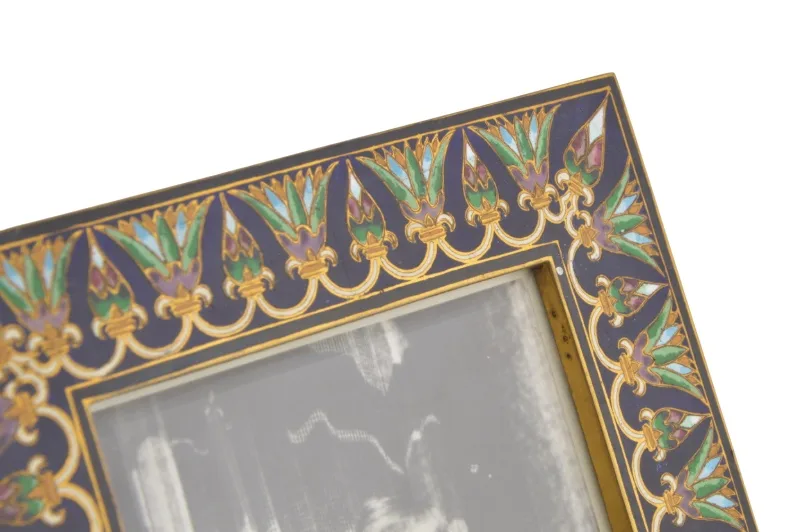 Hier sehen Sie einen Jugendstil Bilderrahmen aus Messing der mit einer farbenfrohen Blumenborte aus Cloisonne Emaille geschmückt ist.