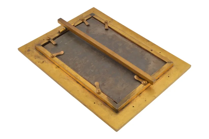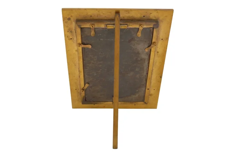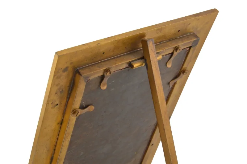 Der Bilderrahmen hat eine geschliffene Glasplatte als Einsatz und ist zum Aufstellen gedacht. Das Bild wird auf der Rückseite mit sechs Schrauben gesichert.