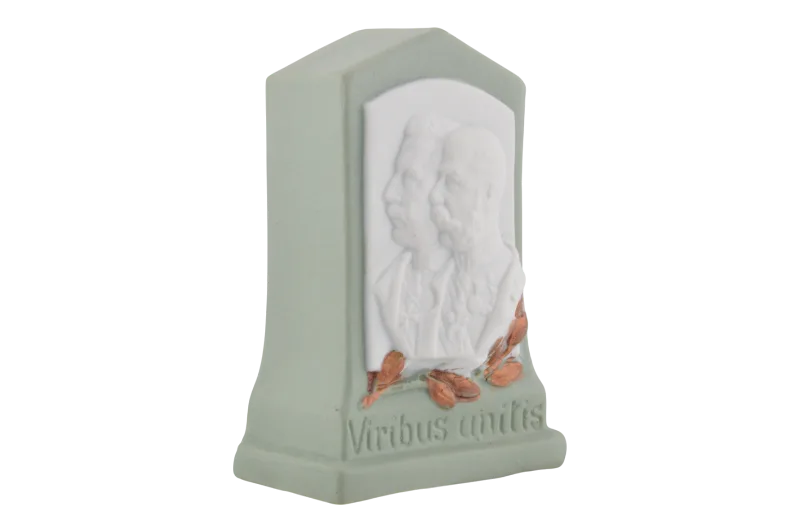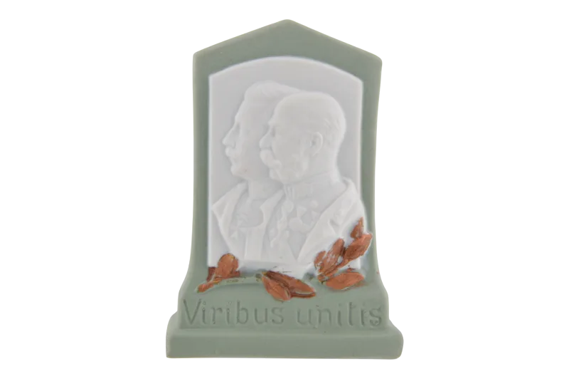 Hier sehen Sie eine Spardose aus Porzellan, die Kaiser Franz Josef und Kaiser Wilhelm der K. u. K. Monarchie abbildet.