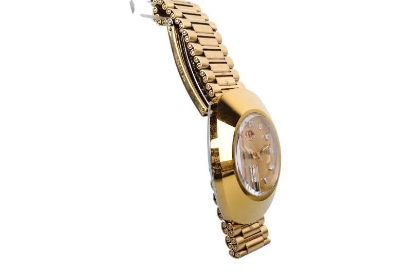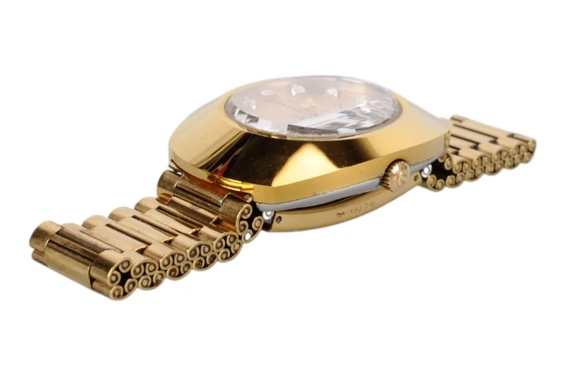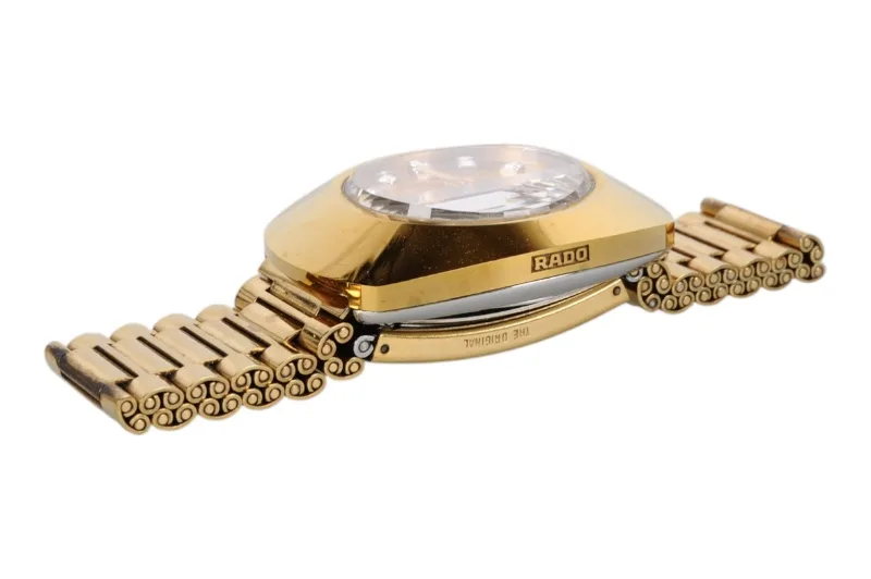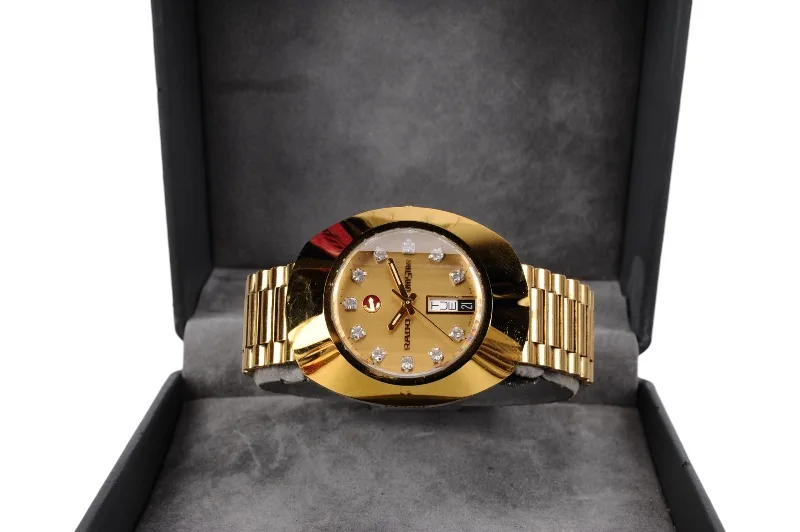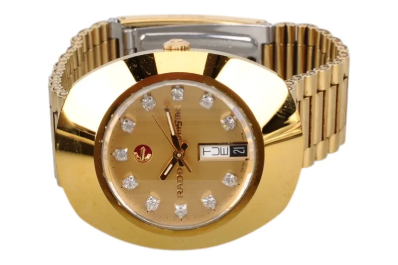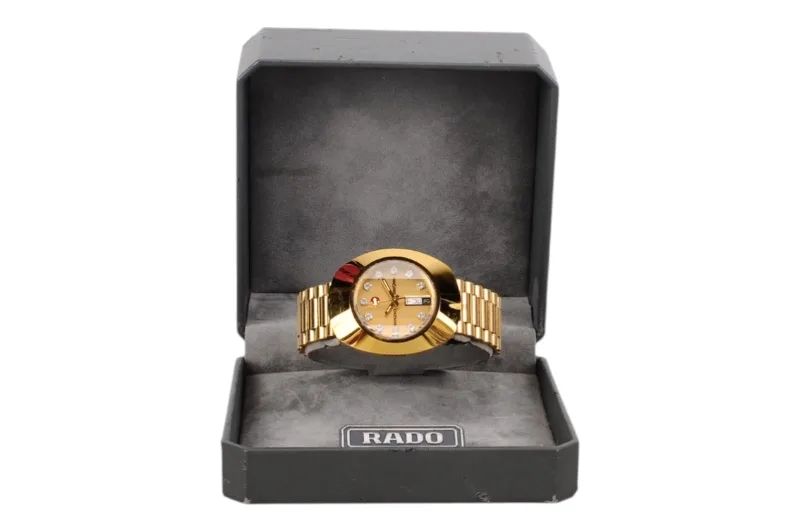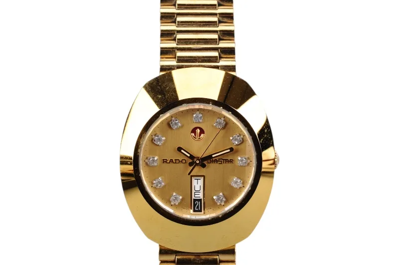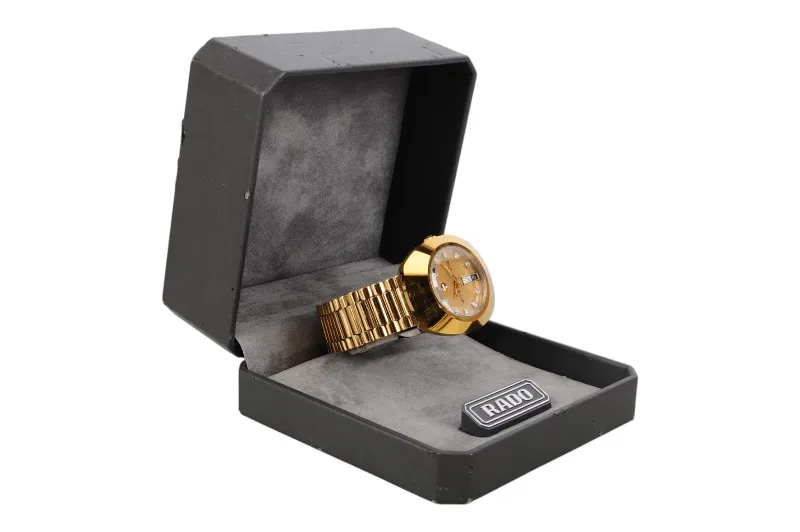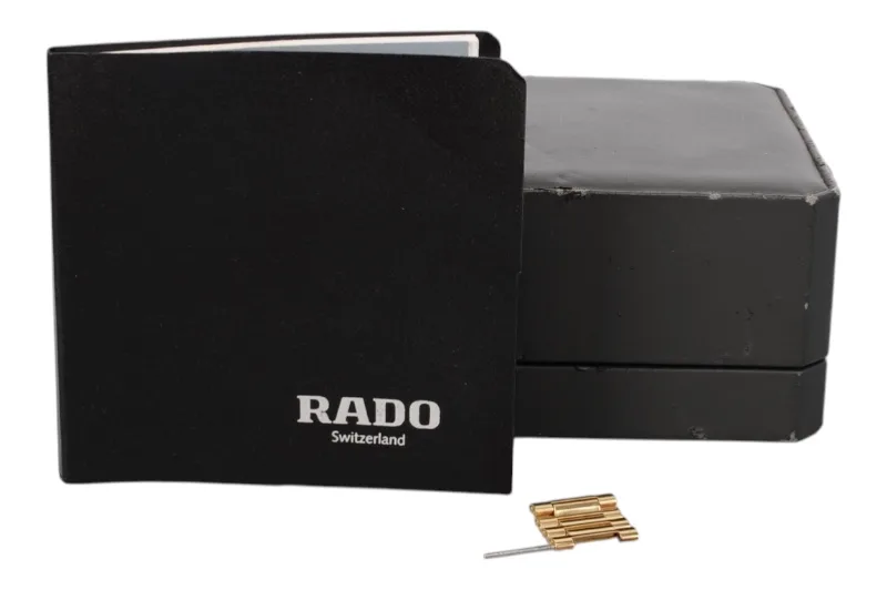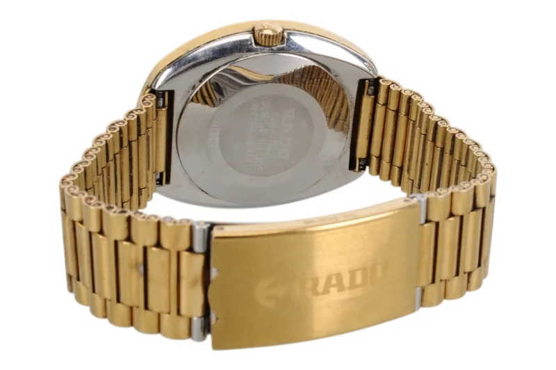 Hier sehen Sie die Rado Diastar Armbanduhr mit kratzfester Hartmetalloberfläche, die teilweise vergoldet ist.
