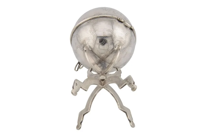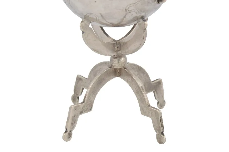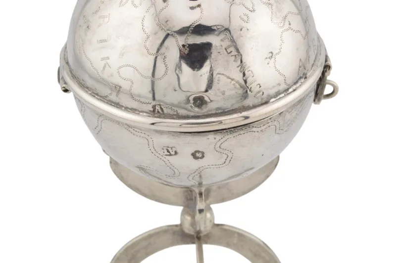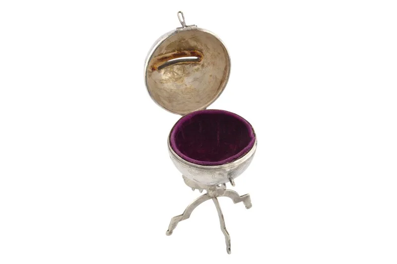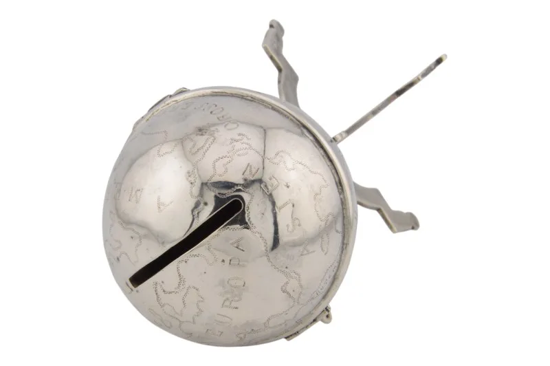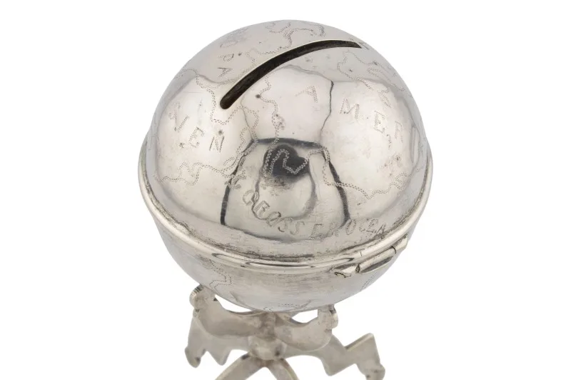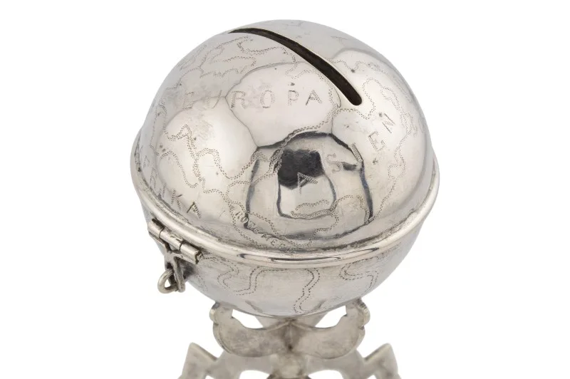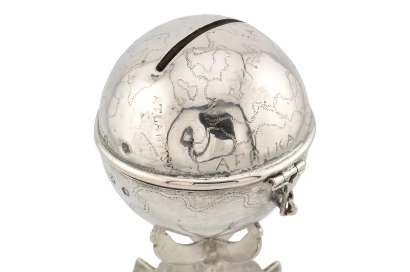 Hier sehen Sie ein einzigartiges historisches Kleinod – eine Spardose aus Silber in Form eines Globus.