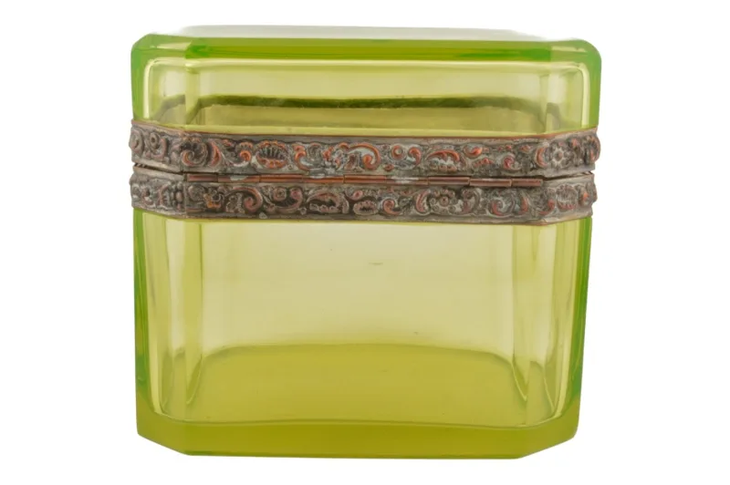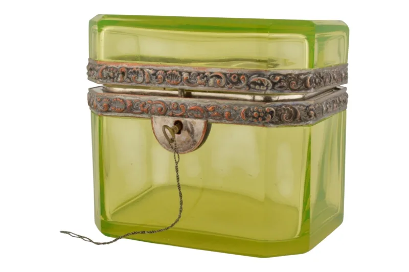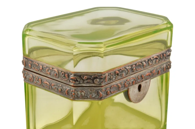 Uranglas Schatulle mit floraler Metallfassung