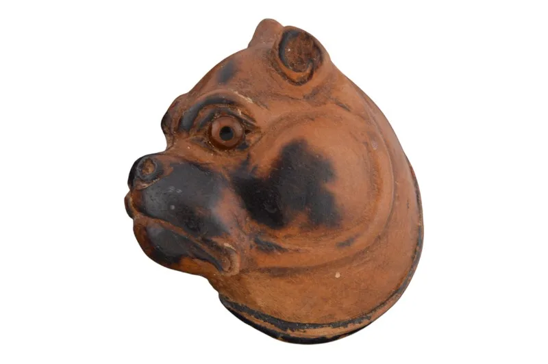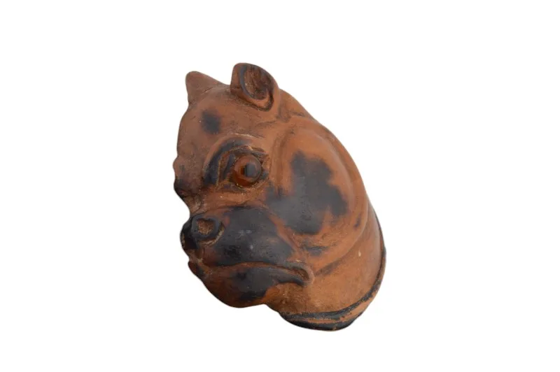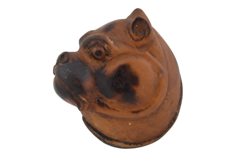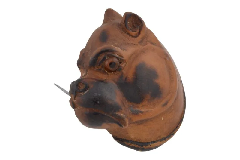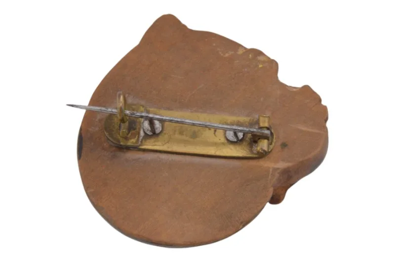 Hier sehen Sie eine seltene handgeschnitzte Holzbrosche, die das Profil einer Bulldogge abbildet.